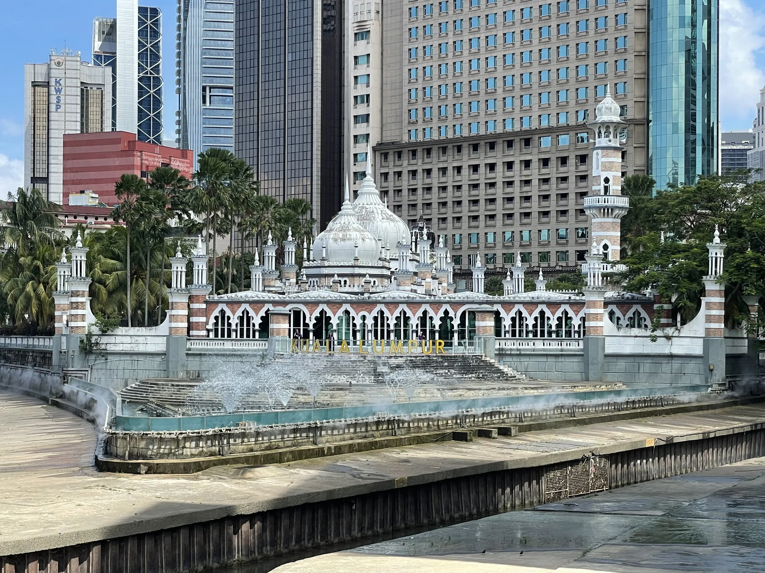 After the chaos of the market, we found peace at the Sultan Abdul Samad Jamek Mosque, one of Kuala Lumpur’s oldest and most beautiful mosques. Built in 1909 at the meeting point of the Klang and Gombak Rivers, it showcases stunning Mughal architecture with its onion-shaped domes, arches, and minarets.