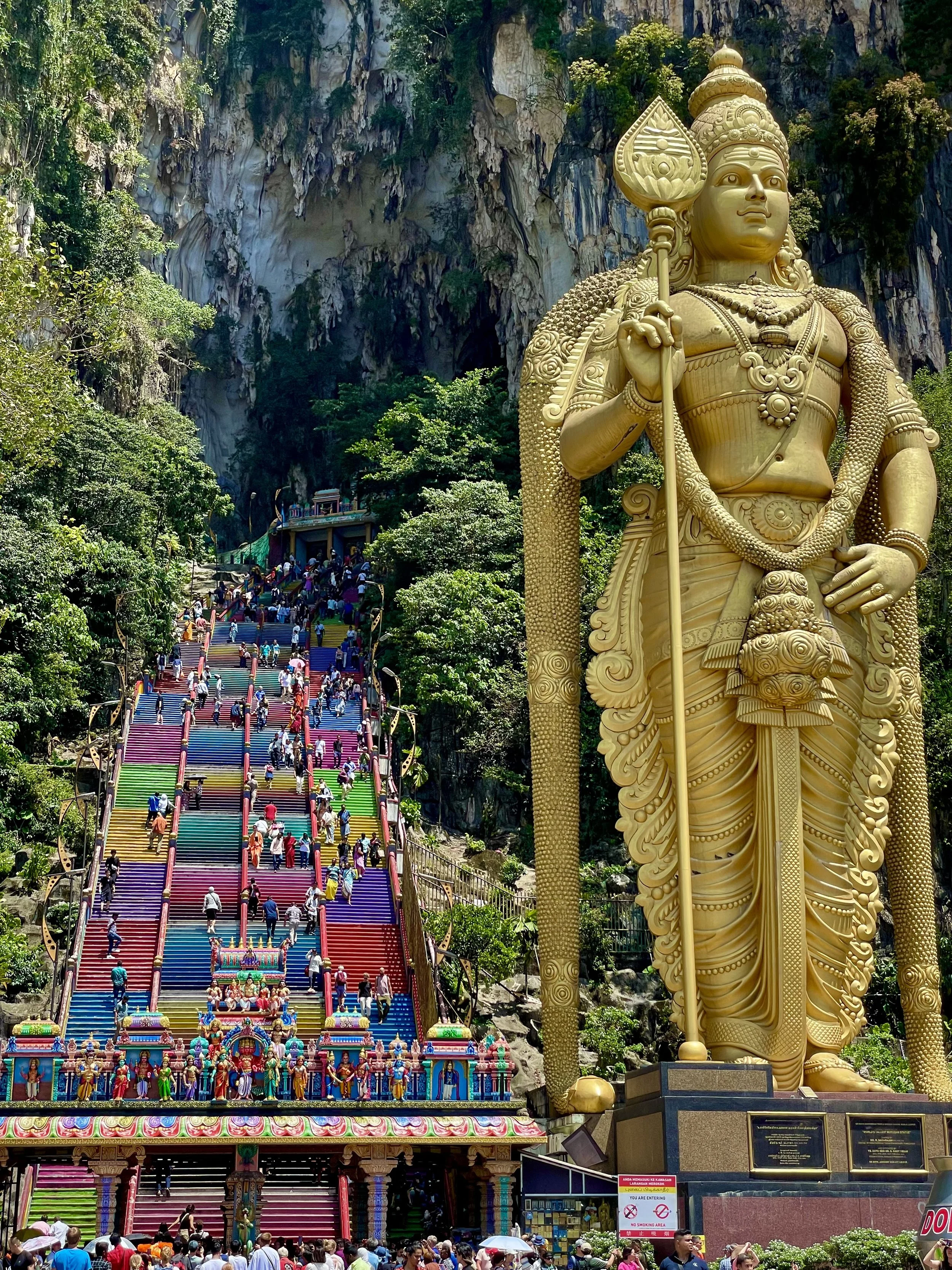 Our final destination of the day was also the most adventurous: Batu Caves. Located just outside the city, this complex of limestone caves and cave temples is one of the most important Hindu pilgrimage sites outside of India. It’s dedicated primarily to Lord Murugan, whose massive golden statue greets visitors at the base.