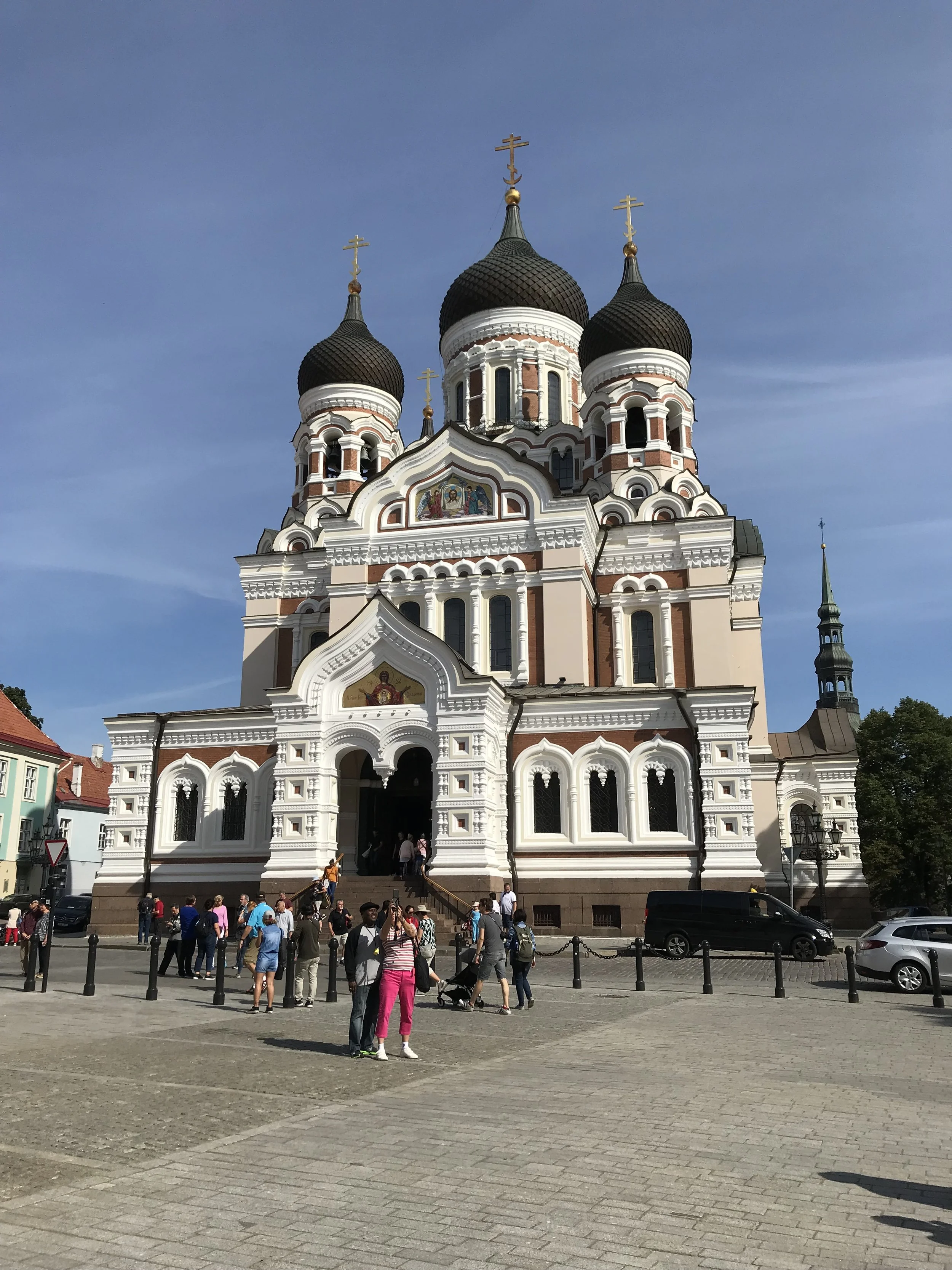 At the top stands Toompea Castle, home to Estonia’s Parliament. Its soft pink exterior sits on older stone foundations, making the building easy to recognize. Just across the square is the Alexander Nevsky Cathedral. The onion domes rise high above the street, and the darker tones of the building contrast with the lighter colors around it. It is strikingly beautiful in person.