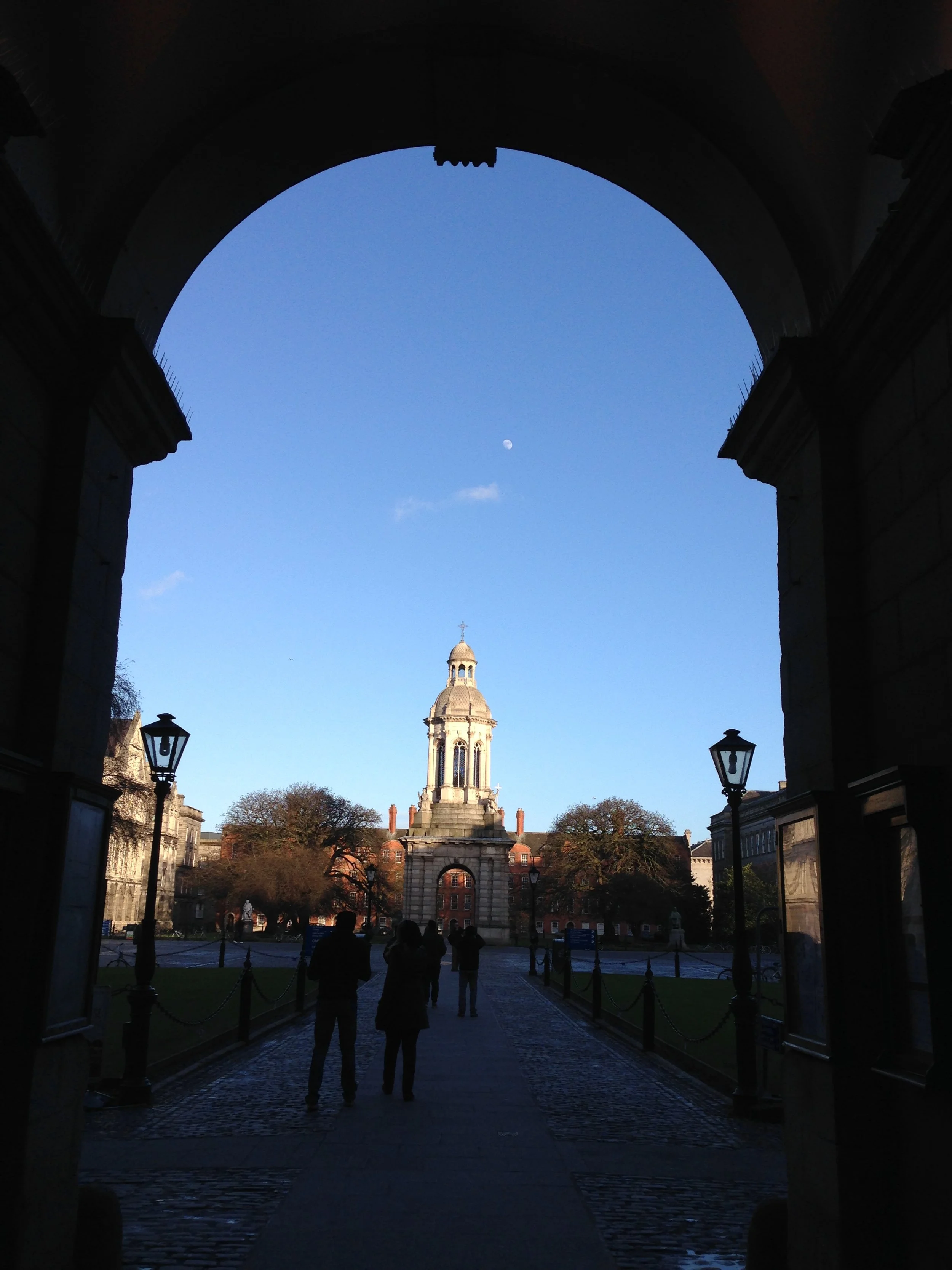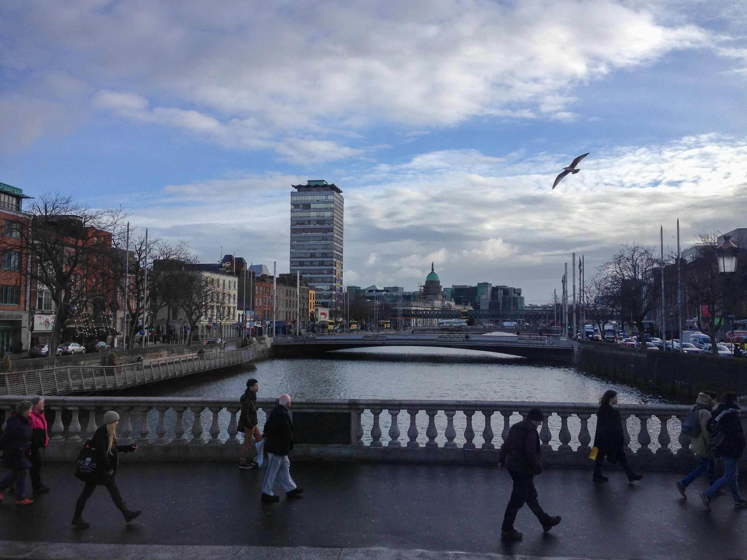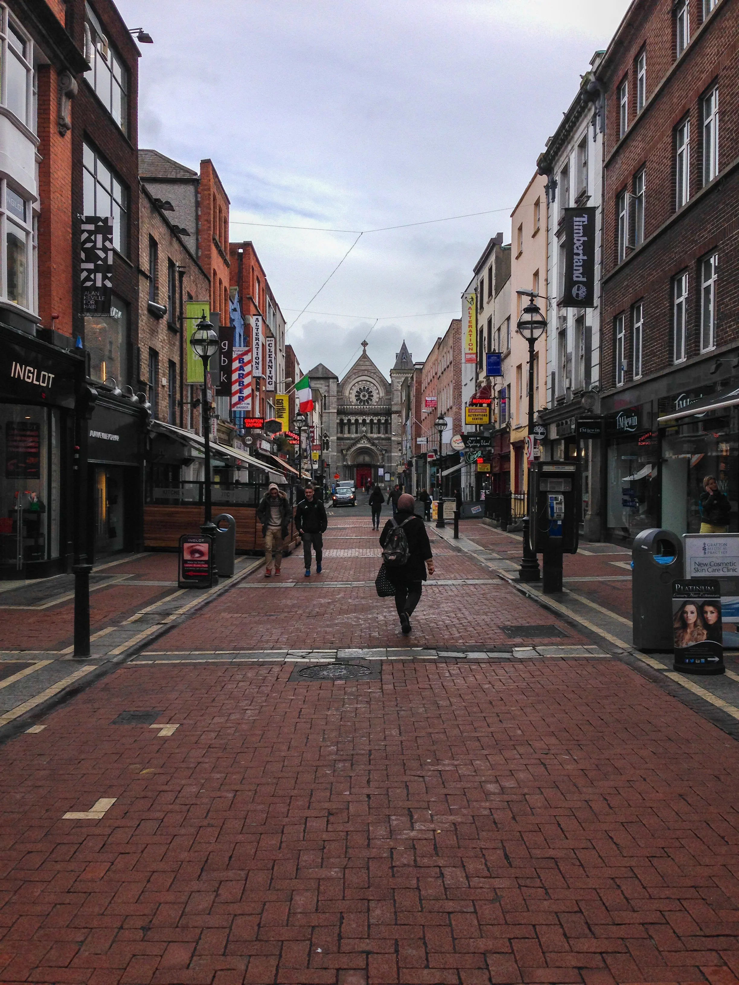 The route began with open stretches of road and low buildings before turning into rows of brick houses and small corner shops. Every few blocks there was a pub or a bridal shop, their window displays glowing against the gray sky. As we got closer to the city, the view opened to stone buildings and banks, bridges over the River Liffey, and the gates of Trinity College just beyond the main street. This was also when I first heard the phrase “the Stiffy on the Liffey,” a nickname for a tall riverside monument officially known as the Spire of Dublin.
