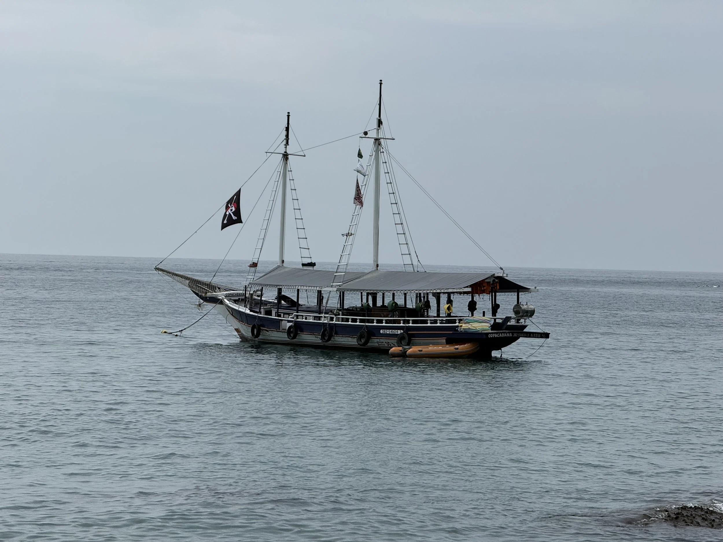 The schooners here are traditional wooden boats, long and low with open sides, bench seating, and a covered canopy for shade. They feel more like something built for leisure rather than speed.