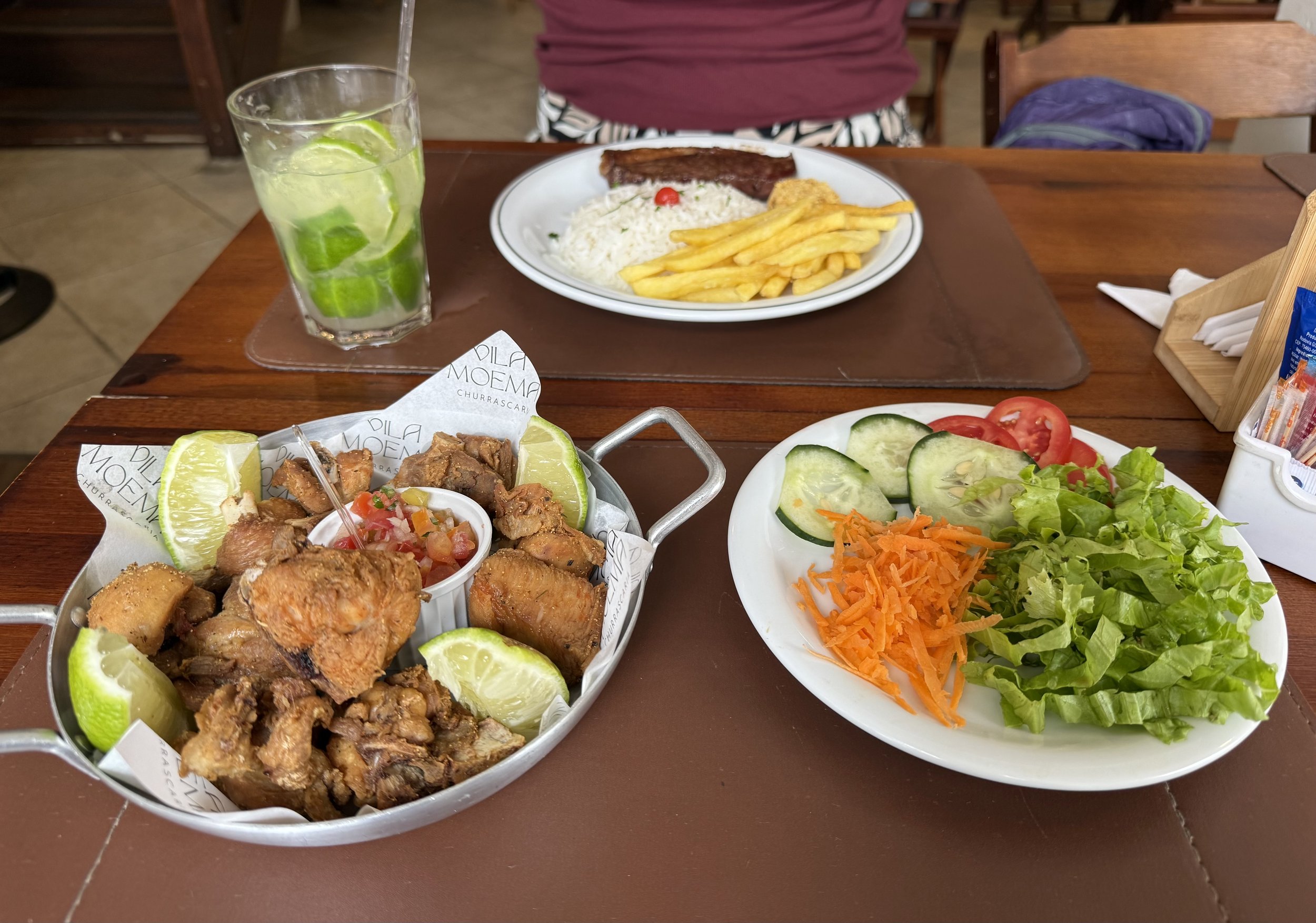 Nearby at Vila Moema Churrascaria, a bright yellow building in the historic center, I stopped for a meal. As a sit down restaurant, it offers a more structured experience with grilled meats being cooked over open heat. They were simple and well-seasoned. It fit the setting perfectly: something local and then back to walking.